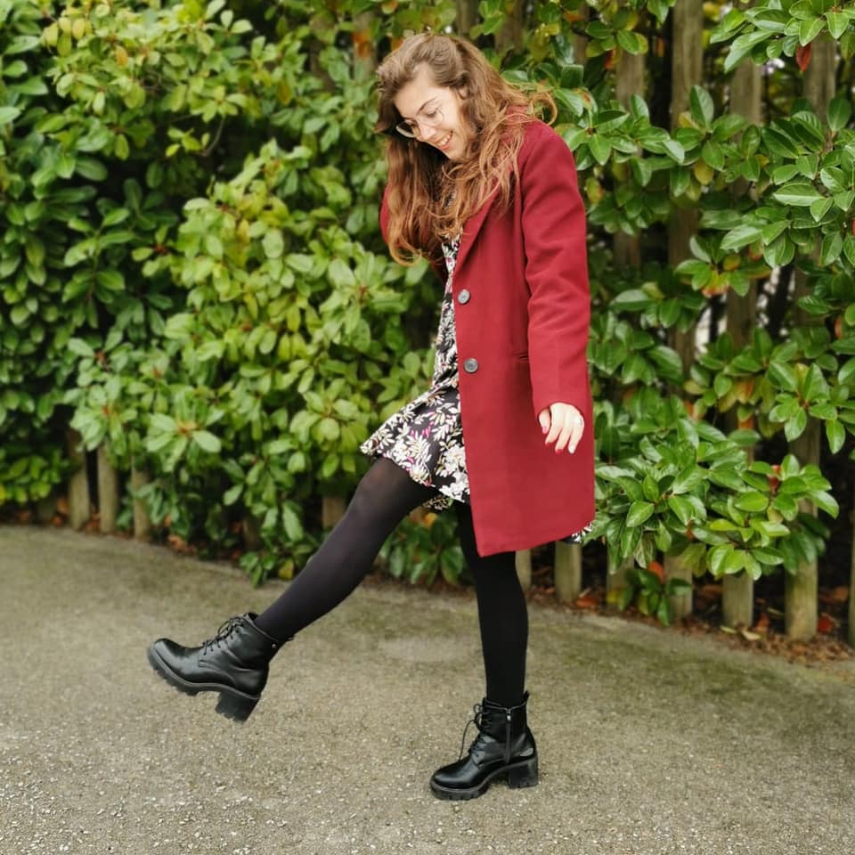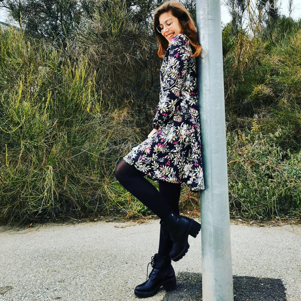 Este vestido, me encanta porque a pesar de que estamos en una época más fría de tonos más apagados, la tonalidad de su estampado le da alegría. En este caso lo he combinado con un abrigo burdeos, unos botines «Xti» de color negro y aunque no se aprecia en la foto llevaba un bolso tote negro «Michael kors».