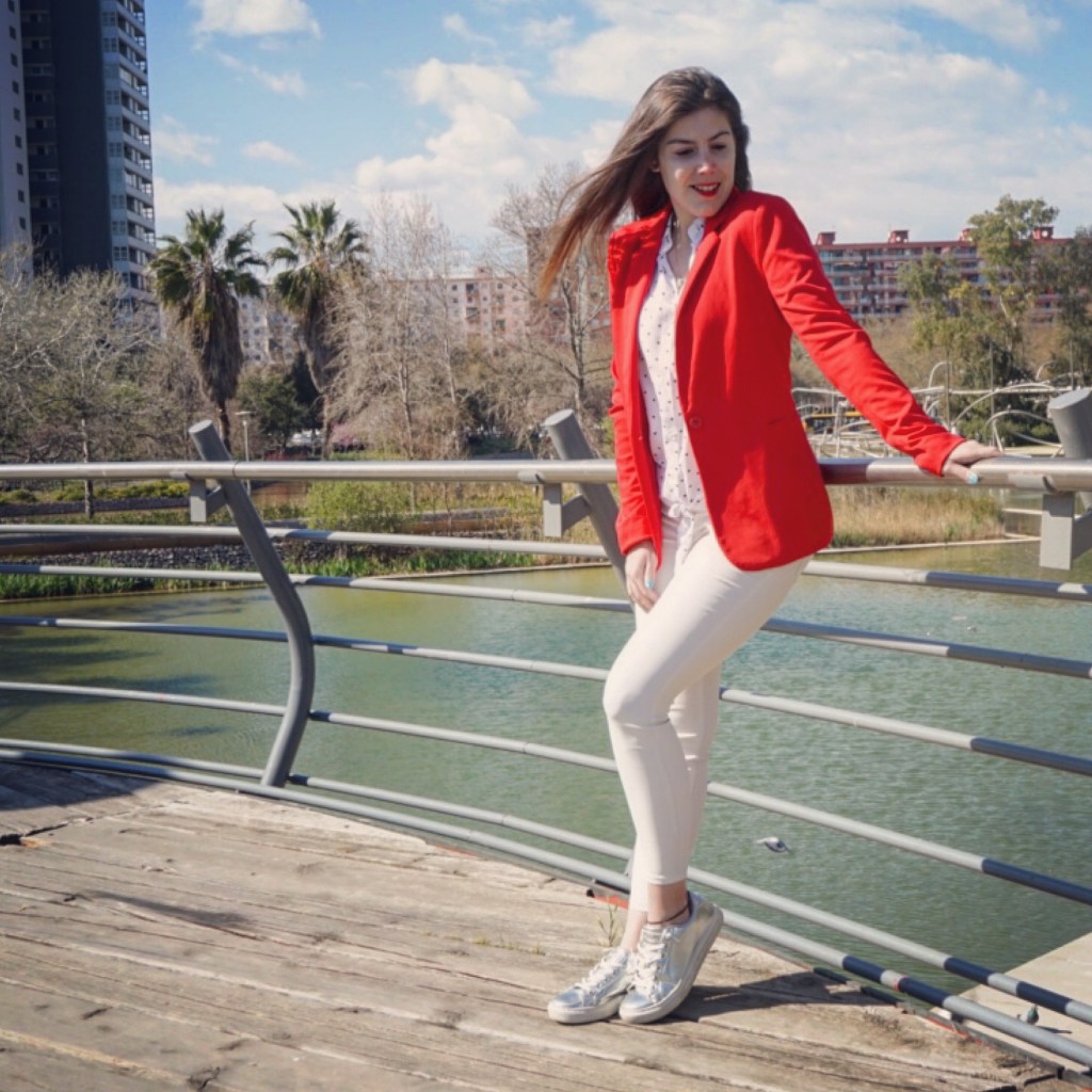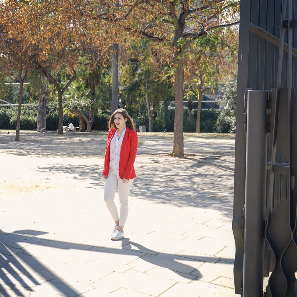 En el siguiente look, yo he apostado por un outfit blanco con una blazer roja como foco de atención, aportando esa vivacidad que le caracteriza.