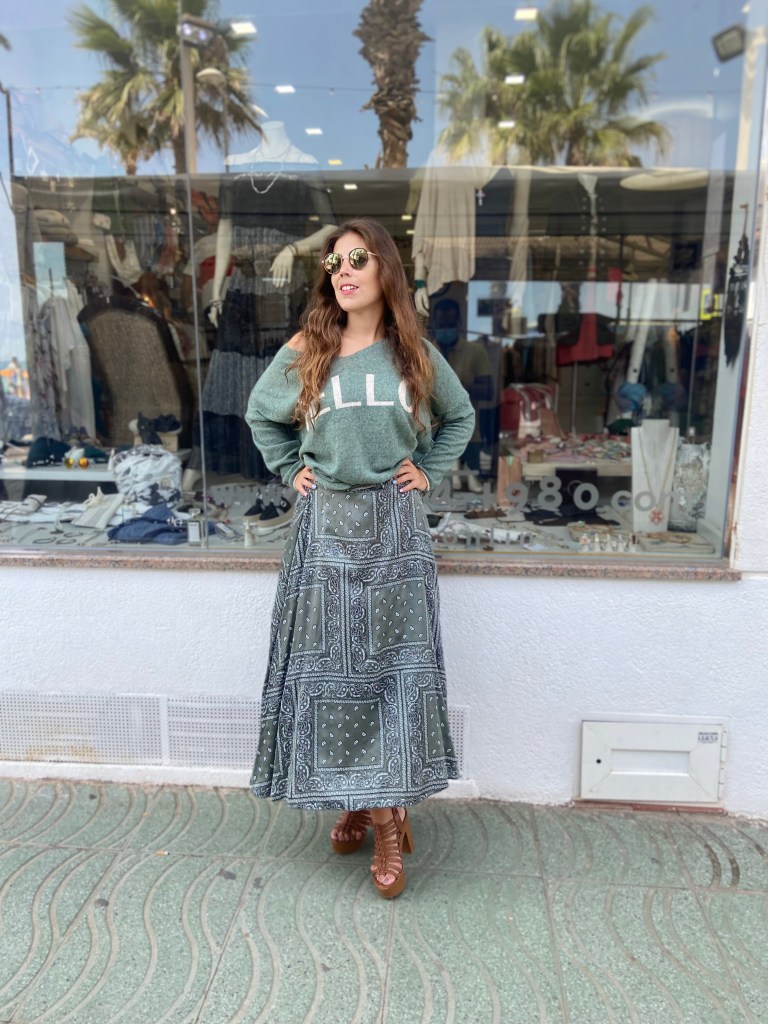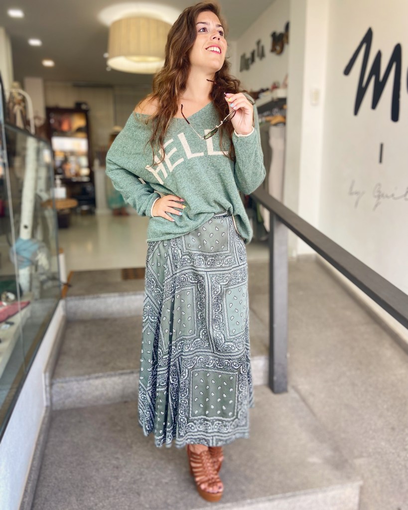 Por último, entra en jugo el jersey con una falda estampada en tonos verdes: