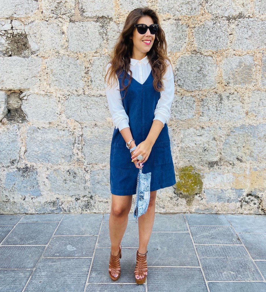 En primer lugar, destacamos un pichi de pana color azul marino con una blusa blanca de la marca «Mus Bombón» y un bolsito a conjunto a tono de la marca «De la Mur».