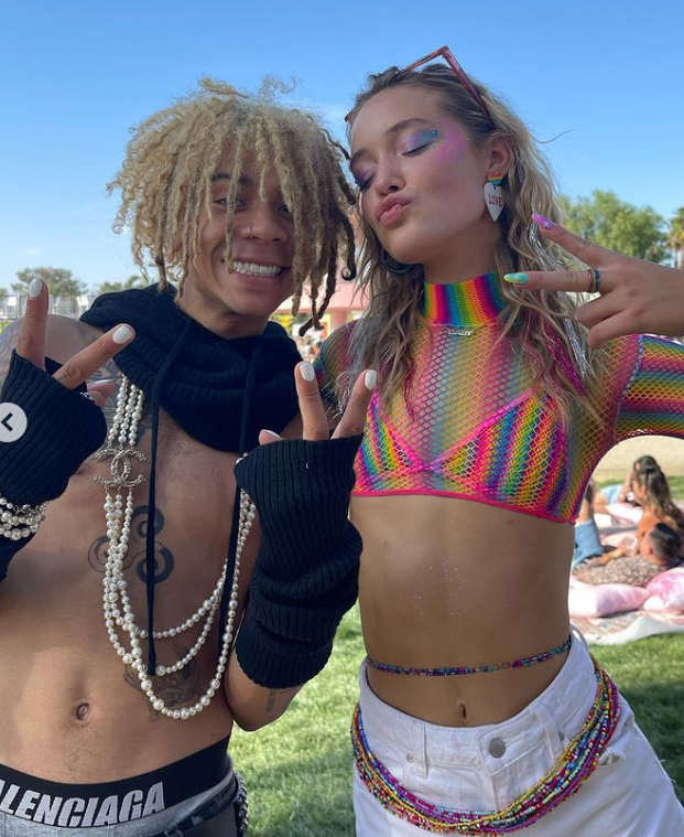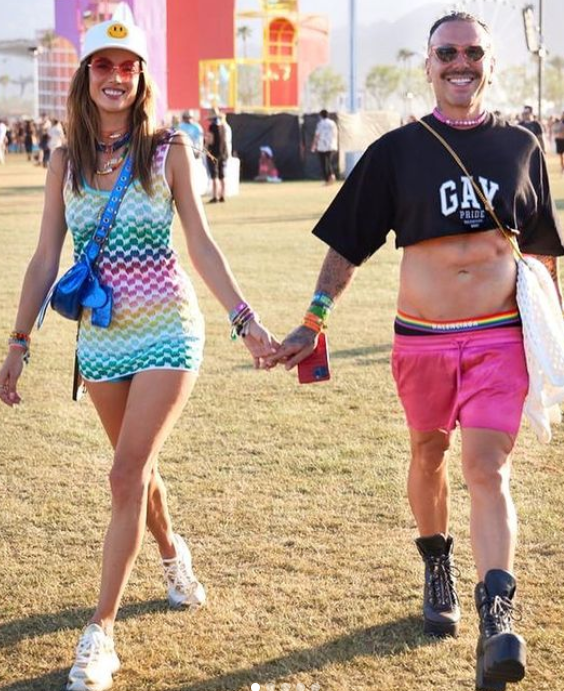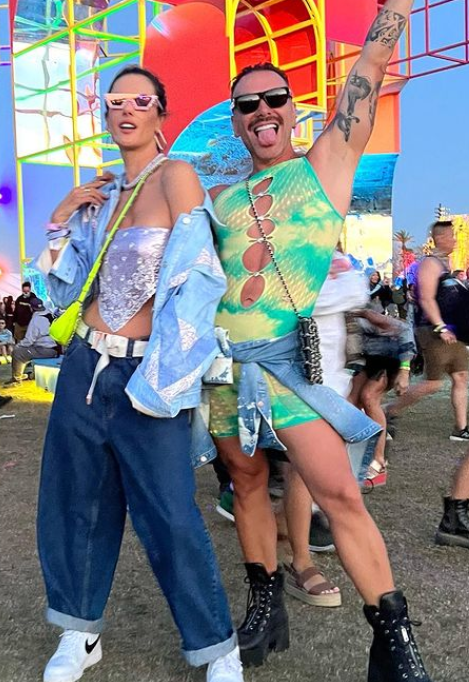 5. Estilo Y2K: Este estilo es el que representa a los años 2000, con pantalones de tiro bajo, pañuelos a modo de top, gafas de colores alargadas o cadenas a la cintura. Look de Matheus Mazzafera con Alessandra Ambrosio y Anitta.